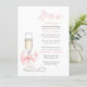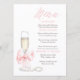 This adorable vintage chic menu design reflects modern elegance and timeless charm, featuring a romantic pink bow and a prosecco glass with white pearls nearby.