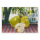 A juicy pears sit on the picnic table under the dappled shade of a tree. The original is a miniature oil painting by Kathie Miller