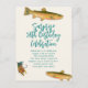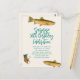 Carte postale d'invitation pour un pêcheur de tout âge. Conception de la truite tachetée et de la pêche à la mouche sur papier écru avec texte bleu-vert foncé. On peut customiser un script plus grand au sommet pour une fête surprise, ou ce libellé pourrait inclure son nom, comme "Happy 50th Birthday Thomas". L'adresse postale peut être ajoutée, une par une, à l'arrière des invitations, ou acheter les cartes postales vierges pour écrire à la main.