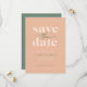 Cette carte de date moderne garde les mots "enregistrer la date" écrits dans un mélange de polices de caractères serif et script et a beaucoup d'espace pour vos noms ainsi que la date et l'emplacement mariage. Il est décoré dans des tons verts pêche et sage.