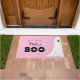 A cute ghost peeks out from the edge of the doormat.    "Peek a BOO" text in fun handwritten style fonts.    Shown in colours of pink, white, and black, but all colours are editable - background, text elements, and ghost.   Personalize the curved text with a family name, etc.  © Kimbellished, LLC