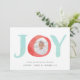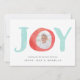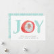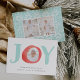 Carte photo de vacances festif et lunatique avec le mot "JOY" en aquarelle avec votre photo dans la lettre "0." Personnalisez le devant avec votre salutation et vos noms personnalisés, et ajoutez deux photos supplémentaires au dos contre un motif de vacances nordique en blanc et vert pastel.