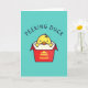 A silly pun which may prompt a quiet exhalation of amusement. Peking duck pun, a duck peeking out from a chinese food takeout box.
