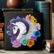 A stunning fantasy artwork of a white pegasus with flowing deep violet mane and elegant feathered wings, surrounded by a vibrant bouquet of colorful flowers. The mix of bold blooms in pink, orange, blue, teal, purple, and yellow creates a magical and uplifting design full of life and grace. Perfect for horse lovers, fantasy art fans, and anyone who enjoys fantasy, nature-inspired beauty.