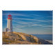 Peggy's Cove Lighthouse on rocky shores of Nova Scotia, Canada against blue skies on sunny day.