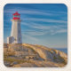 Peggy's Cove Lighthouse on rocky shores of Nova Scotia, Canada against blue skies on sunny day.