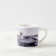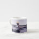 Profile of a pelican - the brown pelican in the original photograph by MaeFlowers on this Espresso Cup is gliding along the water of a canal on Florida's Gulf Coast. The side of a boat in the background shows the shimmering reflections of the blue water. The photo is in shades of blues, soft greys and browns, with a touch of yellow on the pelican's head.