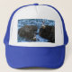Pictured surrounded by thrashing sea swells are two pelicans on big sea boulder rocks.