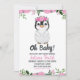 This invitation features a cute baby penguin wearing a pink floral headband. An adorable theme for the little penguin on the way!