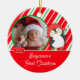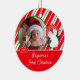Cute Photo Christmas Ornament featuring an adorable happy penguin with a red & green stripe background, just add YOUR PHOTO! Perfect for first Christmas & second Christmas. A Wonder Christmas gift sure to be treasured for many years to come.