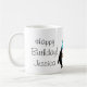 Penguin Birthday mug with red balloon and name. Personalizable design with funny penguin cartoon wearing a party hat and holding a balloon.