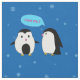 Winter theme design of cute penguins in snowflakes background. The female penguin with long lashes is saying "I love you!" to the chubby male penguin.