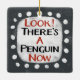 An irreverently weird typographic animal design that says "Look! There's A Penguin Now". It features black and red text on a white rectangle with funky, playful white dots surrounding it, all on a grey background.
