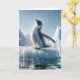 A penguin shakes off water while standing on a floating ice floe surrounded by majestic icebergs under a clear sky for thinking of you.