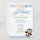 Cute penguin baby shower invitation.. Colourful background. Penguin has a green hair bow and is standing on an iceberg. Pink background. Kristi W/Graphic's n Bits.