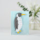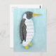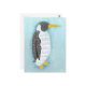 A Cute penguin with whimsical trim and pink dots looks on, over a blue icy background.