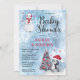 Cute watercolor penguin in a santa hat and snowman with snow falling all around "Baby Shower". Design is in red, grey, dusky blue, black and white. Simply personalize with your shower details. Back features a snowfall pattern over a red background. Composite by Holiday Hearts Designs.