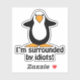 I'm surrounded by idiots! Funny and sarcastic insult with a black and white penguin with orange feet and beak graphic. Penguin Humour cartoon drawing. Wild animal illustration design with a saying/quote.
