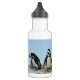 This water bottle features African Penguins standing on a rocky ledge in front of a blue sky. They are aquatic, flightless birds whose wings have become flippers. Each has a black stripe and black spots on the chest. The pattern of spots is unique for every penguin, just like human fingerprints. They have pink glands above their eyes and pink and black feet.