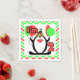 Customized Penguin 2nd Birthday paper plates, great for the penguin theme birthday celebration or great for kids who just love penguins and are two years old! Features a penguin wearing a coral and lime green party hat holding balloons of the same colours, text that reads I'm 2, a border with black decorative ring and chevron stripes of coral, white, and lime green