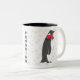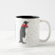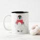 A fat penguin and a tall penguin show off their red winter accessories in the snow