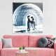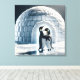 Two penguins slow dancing together on a glistening icy surface in front of a large igloo