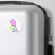A pastel cartoon wizard penguin with a light blue and white body, lavender feet, light yellow beak, and tiny black eyes, wearing a stylish lavender cape and hood with a light blue raindrop-shaped jewel at the end, carrying a lavender and light yellow magic star wand.