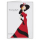 Une couche dans une robe rouge et elle porte un casquette noir et de longs gants noirs.