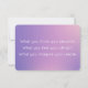 Cette carte d'affirmation comporte une simple citation positive de Bouddah sur elle - "Ce que vous pensez, vous devenez. Ce que vous ressentez, vous attirez. Ce que vous imaginez, vous créez". Vous pouvez modifier ce texte et ajouter n'importe quelle phrase. Modifiez une carte, ajoutez au panier et modifiez à nouveau pour créer un jeu de cartes inspirantes. Dans l'arrière - plan est un dégradé abstrait rose et violet - que vous pouvez remplacer par une photo de votre choix. La carte est également décorée d'un mandala fleuri à l'arrière. Le mandala est une oeuvre originale de Jessica Amber. Il s'agit d'un outil élégant pour améliorer votre orientation spirituelle - méditez sur l'expression, ou mettez-la dans votre portefeuille et se faire rappeler chaque jour le but de votre âme. ・ ・ ・ Pour plus de papeterie spirituelle, visitez mon magasin Zazzle.com/In_The_Vortex
