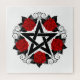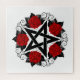 Black pentagram with pattern, decorated with blooming, red roses with leaves on white background. Tattoo style.