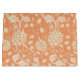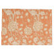 Woodblock pattern of peonies and wild tulips against a coral background.