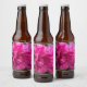 A beer bottle label featuring a photo of peonys.