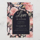 An elegant and modern, boho chic "Love is in Bloom" bridal shower invitation featuring a watercolor painting of blooming peonies and modern calligraphy, as well as a boho arch frame with a gold foil overlay (this is a digital effect), on a dark navy background. A perfect choice for an evening garden party bridal shower in the spring, summer or fall, indoors or outdoors.