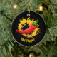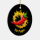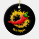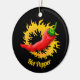 Red chili pepper with circle of flame. Custom background colour. Custom text on both sides.