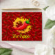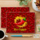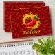Red chili pepper with circle of flame on removable seamless pattern background. Custom text.