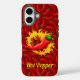 Red chili pepper with circle of flame on removable seamless pattern background. Custom text.