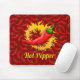 Red chili pepper with circle of flame on removable seamless pattern background. Custom text.
