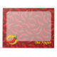 Red chili pepper with circle of flame on removable seamless pattern background. Custom text.