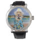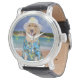 Une montre avec un labo jaune de 30 kg, en chemise hawaïenne, sur une plage tropicale. Quatre positions principales sont marquées par des panneaux suspendus. Cela vous gardera, espérons-le, léger coeur pendant la journée. Vous pouvez modifier les options de montre. L'arrière - plan de plage est un tableau public.