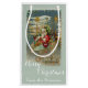 Voici Père Noël ! Il dirige son appareil volant extraordinaire à travers le ciel nocturne. Étoiles, serpentins et décorations fantaisistes se succèdent sur le pont de l'avion et son lot de jouets merveilleux pour Noël matin. L'image restaurée d'une carte postale victorienne présente un arrière - plan glacé, des accents dorés et de belles couleurs vives. Il est encadré de glace et d'ornements avec un village de Noël en arrière - plan.