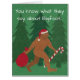 A l'intérieur on peut lire : "GROS Noël !" Cette carte de voeux humoristique de Noël de taille jumbo ajoutera un peu d'hilarité à vos vacances. En rouge, vert blanc et marron ma fury Bigfoot Père Noël design montre Sasquatch flâner dans la forêt en livrant des cadeaux à tous les bons petits garçons et filles. Avec un sac de jouets dans sa main droite, un sucre de canne colossal dans sa gauche et un chapeau de Père Noël rouge et blanc perché sur sa tête, cette carte de voeux géante de Squatch de Noël est parfaite pour ce geek de chasseur de cryto sur votre liste et est également disponible en taille standard si vous voulez faire ces cartes de fin de année cette saison.