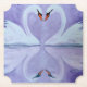 The painting depicts a misty, purple lake with two swans on it. The swans tilt their heads toward each other, arranging their necks in the shape of a heart. The graphic looks beautiful on paper coasters and wedding accessories.