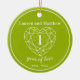 Peridot celebrating 1 year of love wedding anniversary and your own photo on the back ornament. Simple outline heart stone art graphics peridot bright green and white 1st Wedding Anniversary ornament. Customize your ornament with your own, names, wedding anniversary dates, and a special couples photo or wedding photo on the reverse. The 1st wedding Anniversary is associated with green peridot and the heart symbolizes love. Other matching items and wedding anniversary celebrations are available. Graphics and design by Sarah Trett for www.mylittleedenweddings.com on Zazzle.