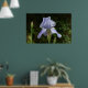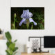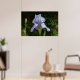 Pretty periwinkle iris with white centre and yellow beard and buds ready to open in the background. Raindrops on delicate petals. Green shrubs are blurred in the distance. Original Photography © TamiraZDesigns.