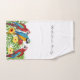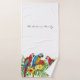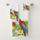 Oiseaux tropicaux, perroquets en bleu, jaune et rouge assis sur des feuilles de palmiers verts. Décoré de fleurs tropicales. Arrière - plan blanc élégant. Modèle pour votre nom de famille, écriture de style en lettres de couleur noire. Utilisez votre clé arrière-espace pour supprimer si vous voulez la serviette sans texte ou nom.