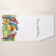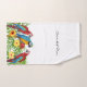Oiseaux tropicaux, perroquets en bleu, jaune et rouge assis sur des feuilles de palmiers verts. Décoré de fleurs tropicales. Arrière - plan blanc élégant. Modèle pour le nom de votre maison, de votre maison de plage, ou de votre nom de famille, écriture de style en lettres noires. Utilisez votre clé arrière-espace pour supprimer si vous voulez la serviette sans texte ou nom.