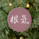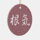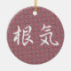 On a background of plum blossom, the Japanese kanji for 'perseverance' 'is written in flowing gyosho style script. Perseverance is 'konki' in Japanese, and plum blossom is a traditional symbol of perseverance, often beginning to bloom while there is still snow on the ground.