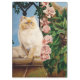 A cream coloured Persian cat with dirty pink roses lining the wall beside the cat. Close by is a beautiful fae green dryad of Celtic lore