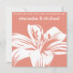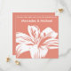This minimalist save the date invitation features a silhouette of a white lily on a peach persimmon background, a simple two-toned colour scheme for a summer or autumn wedding.