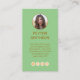 I’ve been introduced to quite a few people who have handed me a card for their day job, and then added a personal card to the stack. It seems that carrying multiple cards is becoming common. This design has photos of each partner on opposite sides of the card. The photos and text are on a coloured (green) background.